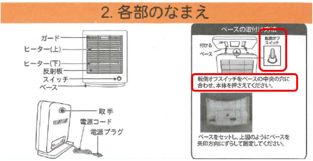 説明文:転倒オフスイッチをベースの中央の穴に合わせ、 | 転倒オフスイッチは内蔵型です。 (ボールのコロコロ音がします) 底部の形状が異なりますので、説明文、イラスト、 イラスト説明文の記載は無しです。 |